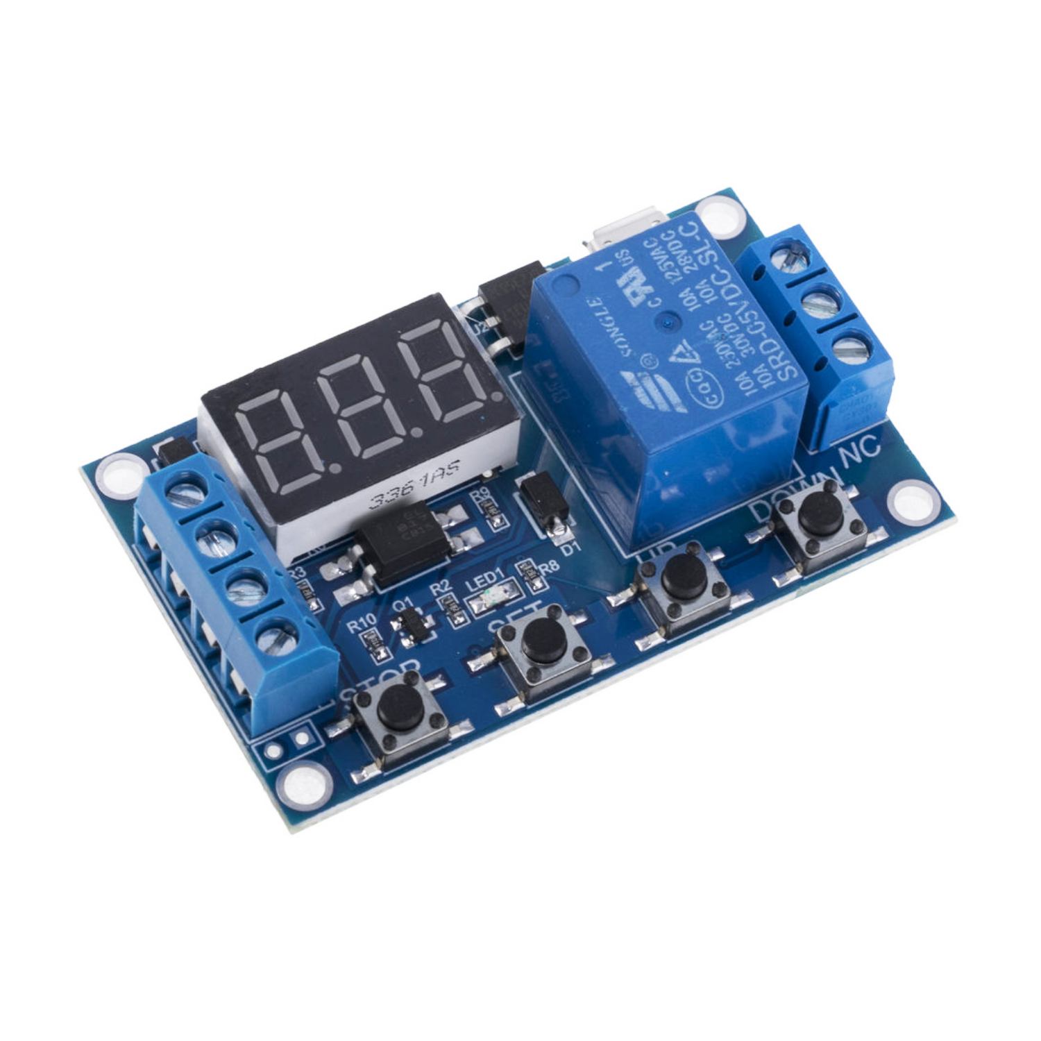 - OP - время нахождения реле во включенном состоянии. На дисплее отображается три цифры, это время работы реле, которое изменяется кнопками UP и DOWN, в большую или меньшую сторону. Также помимо цифр отображается точка разрядности, которая перемещается при нажатии кнопки STOP. Если точка находится после третьей цифры, то период устанавливается в секундах. Если она стоит после второй цифры - время устанавливается в десятых долях (0.1) секунды. Если же горят все три точки, то период устанавливается в минутах. Соответственно длительность одного периода можно установить в пределах от 0.1сек до 999 минут. После задания необходимой длительности сохраняем настройки режима длинным нажатием кнопки SET.