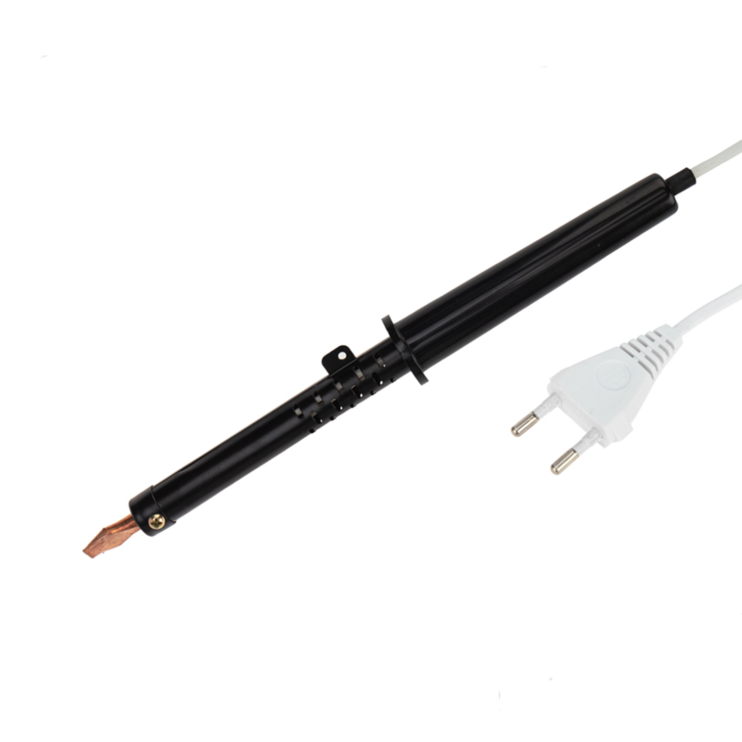 Паяльник электрический с пластиковой ручкой и клиновидным жалом удобен в работе и быстро прогревает достаточно толстые поверхности.